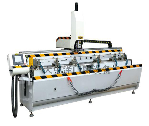 采用先进的PLC工业数控系统,电脑编程,设备操作简单方便,简单方便,效率高,为你省时省力。适用于铝合金工业铝材,铝木复合型材、铜型材等轻质合金以及U-PVC型材的加工。采用进口高精度直线导轨运动副、滚珠丝杆、齿轮齿条及进口伺服电机,保证运行平稳,具有较高的定位及加工精度。采用高品质进口高速电主轴,确保加工稳定性,转动稳定,嗓音小,切削能力强。主轴转速可调,手摇脉波发生器,方便对加工原点的对比和测量。可图形对话编程或离线编程转入工控控制系统;具有程序保存功能,使用方便快捷、可设转工作台,能够在-90°、0、90°三个位置任意转换,实现一次夹装可完式三个面的铣削加工。